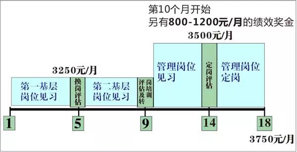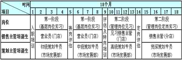 主 管培训生有18个月的培育期,按照循序渐进的原则分成两个阶段(第一阶段包括基层岗位1实习、基层岗位2实习——第二阶段包括管理岗位见习、管理岗位定岗 实习)。每个阶段都会从订立清晰的绩效、行为目标开始;为帮助培训生达成目标,公司会提供系统的知识、技能方面的培训,帮助培训生有能力接受不同阶段、不 同岗位的挑战;每个阶段都以考核结束,通过考核即可顺利进入下一阶段并调整薪资。
